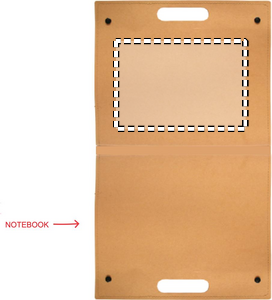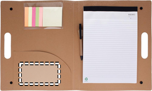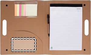Konferensmapp i återvunnen papp med post-it lappar i 6 olika färger i två storlekar, 20 sidigt vitt linjerat block och penna med blått bläck. Försluts med 2 tryckknappar.