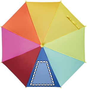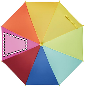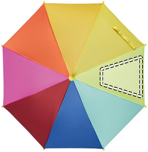 18'' barnparaply i 190T pongee med regnbågsmönster. Det har 8 paneler. Manuell öppning och uppfällning. Ribbor och ram i glasfiber. Handtag och spetsar i plast. Böjt handtag.