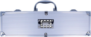 Aluminium väska med 3 olika grillredskap i rostfritt stål. Tranchergaffel, grillspade och grilltång. Metallbricka utvändigt på väskan för märkning av ditt budskap.