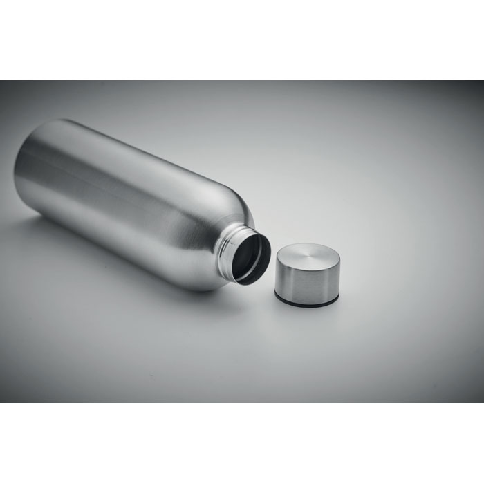 Flaska med enkelvägg i återvunnet rostfritt stål (90 % återvunnet rostfritt stål och 10 % rostfritt stål). Läckagefri. Volym 750 ml. Eftersom detta är en enkelväggig flaska kan flaskan bli varm på utsidan vid varma drycker.