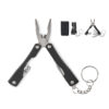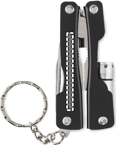 Vikbar multiverktygskniv med ficklampa i rostfritt stål. Innehåller 10 verktygsfunktioner samt väska i 600D polyester. Inklusive 3 x AG3 knappceller.