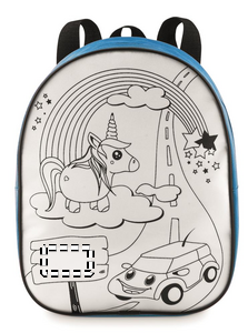 Ryggsäck för barn med 5 st pennor för att färglägga motivet på ryggsäcken. Material 600D polyester.