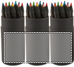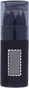 Svart Pennset med 12 färgade blyertspennor med en pennvässare i locket på asken.