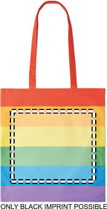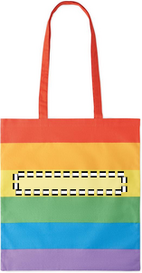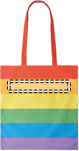 Regnbågsfärgad kasse i bomull med långa handtag. Sätt lite färg på ditt varumärke eller speciella budskap med den här glada tygpåsen. Den här väskan är idealisk för dagliga matinköp eller alla pride event. Du kan bära den i de långa handtagen eller hänga den över axeln för att ha händerna fria. Max bärvikt 2,5 kg. 200 gr/m² Denna produkt är certifierad enligt OEKO-TEX® STANDARD 100.