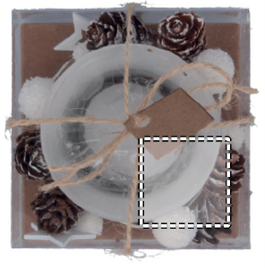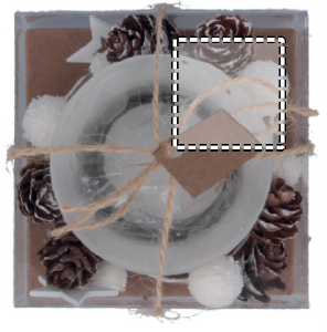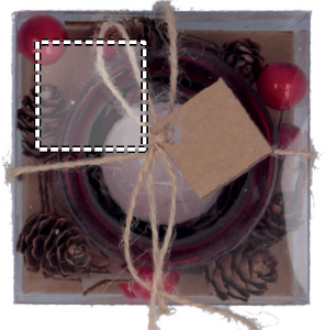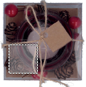 Ljuslykta i glas omgiven av juldekoration. Förpackad i transparent presentbox med etikett för en personlig hälsning.