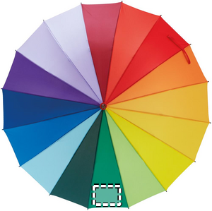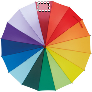 27 tums 16 panel regnbågsfärgat paraply i 190T Pongee med träskaft, glasfiberribbor, svartpläterade metallspetsar och topp samt auto öppning. Använd det här färgglada regnbågsparaplyet för att hålla dig torr under regnet. Med den här designen kommer du definitivt att bli uppmärksammad. Ett måste till varje Pride event.