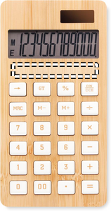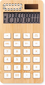 kalkylator i bambu med 12 siffror. Drivs av solcell och batteri. Matrial bambu och ABS. 1 cellbatteri ingår.
