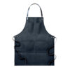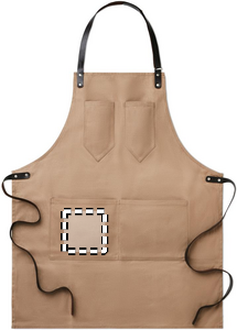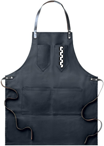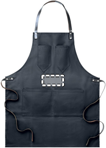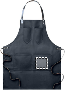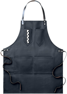 Förkläde i vaxad canvas med läderdetaljer, justerbart band med 2 bröstfickor och 1 stor ficka nedtill.