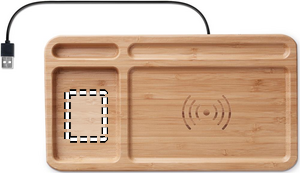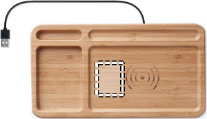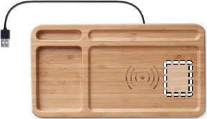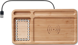 Skrivbordställ i bambu med trådlös laddstation. 80 cm USB laddsladd ingår. Output DC5V/1A (5W).