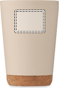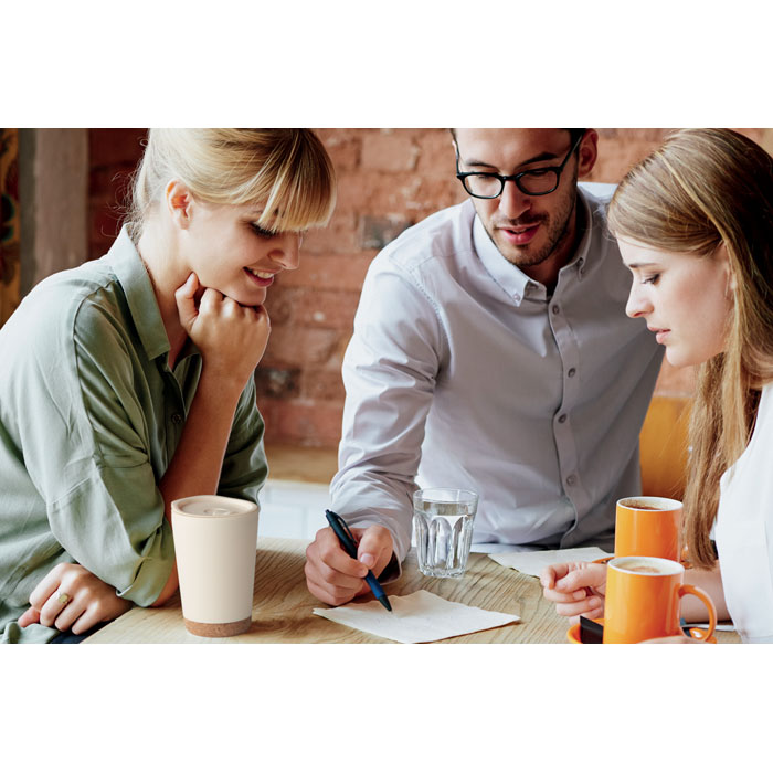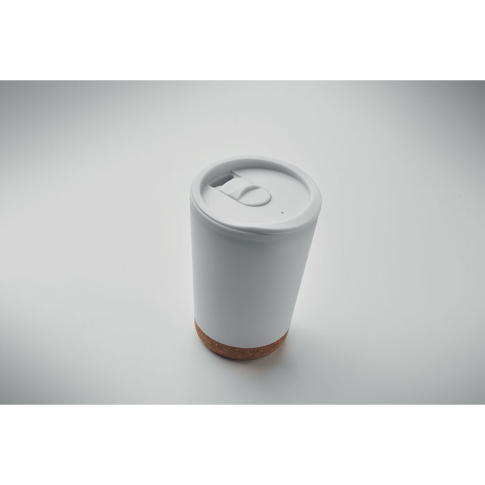 Dubbelväggig mugg i PP med korkbas och lock med skjutbar dricköppning i PS. Volym: 300 ml.