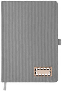 A5-anteckningsbok med hårt RPET-polyesterpärm i manchester och 192 linjerade sidor av återvunnet papper (70 gr/m2). Bunden med elastisk band, pennögla, sidmarkörsband och tagg i tvättat kraftpapper.