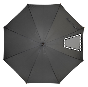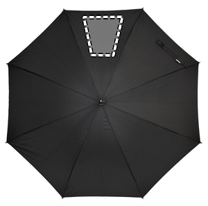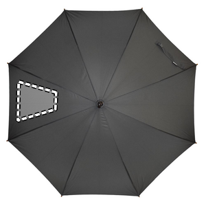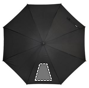 Promenadparaply, 23 tum. Med automatisk öppning. Exklusivt Pongee material i 190T återvunnen RPET. Skaft, sprötspetsar och topp i trämaterial. Svartpläterade metallribbor. Böjt naturligt trähandtag. Manuell stängning.
