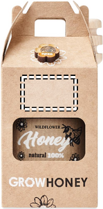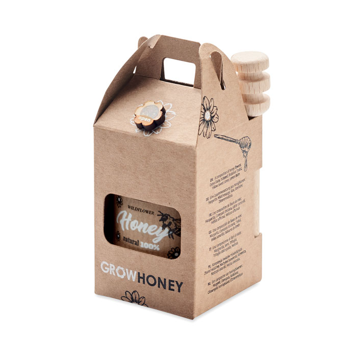 Vildblomshonungburk (50 g) med en honungsdoppare i trä. Ge någon den här burken med utsökt färsk vildblomshonung i present. Det blir en uppskattad gåva. Den innehåller frön till honungsbiblommor, så att du kan odla dina egna blommor i trädgården som lockar till sig bin. Levereras i en kartong av kraftpapper. Tillverkad i EU.