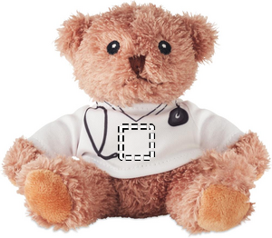 Nallebjörn av polyester klädd som läkare med vit T-shirt med tryck. Broderade ögon, näsa och mun.