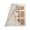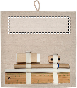 Pennskrin i jute och bomull med en bambu linjal, penna av papper, bläckpenna med blått bläck av kartong, en trä pennvässare och ett suddgummi. Bra miljöval!