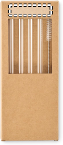 Förpackning med 4 återanvändbara sugrör i borosilikatglas med 1 rengöringsborste.