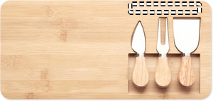 Bamboo cheese set med en serveringsbräda, 2 serveringsknivar och en gaffel. Presentera ett ostfat med stil. Den här naturliga träbrädan och de matchande redskapen används för att servera andra typer av mat och snacks på fester eller vid en middag. Bambu är en naturprodukt, det kan förekomma små variationer i färg och storlek per föremål, vilket kan påverka det slutliga märkresultatet.