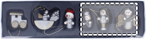 6 olika julgransdekorationer i trä som är förpackade i en presentkartong med transparent lock.