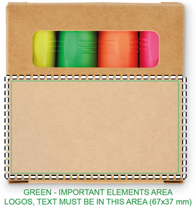 Set med 4 överstrykningspennor i en kraftlåda. Färgerna gul, grön, orange och cerise.