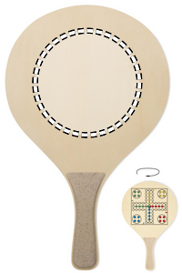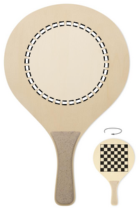 Strandset med 2 racketar i plywood och spelbrädor för schack och ludo. Innehåller 1 TPR-boll, tärningar och pjäser. Förpackade i en väska med dragkedja i RPET-nät. FSC®-certifierad plywood.