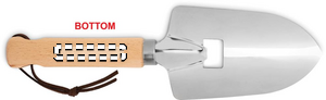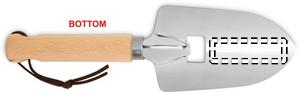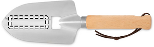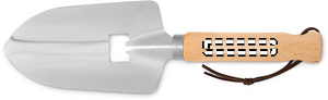 Planteringsspade i rostfritt stål med trähandtag och snöre samt kapsylöppnare i bladet.