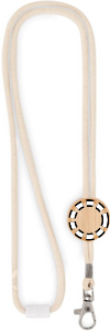 Logoband i bomullssnöre med rund bambudetalj, metallkrok och säkerhetsspänne. Längd: 50 cm.