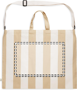 Extra stor randig strandväska i 280 gr/m² återvunnen bomull (80%) och återvunnen polyester (20%) med innerficka. Korta handtag och en stor, justerbar axelrem.
