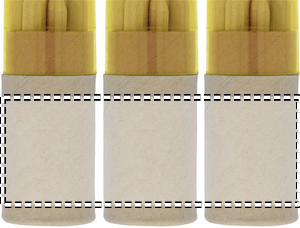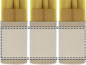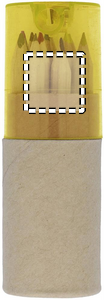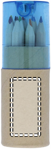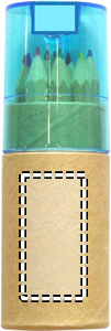 12 färgade trä blyertspennor i tub. Pennvässare i transparent lock.