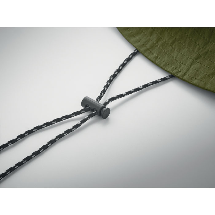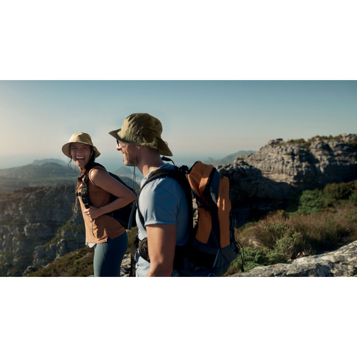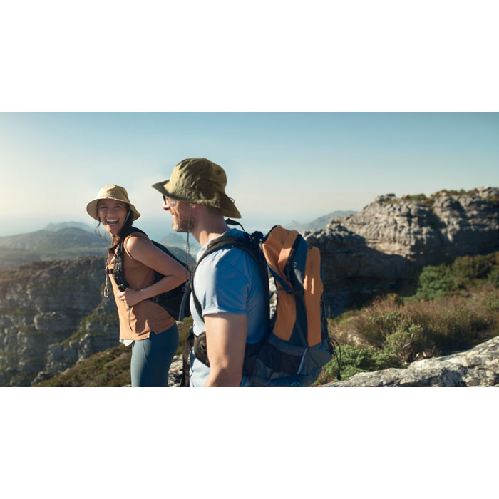 Vattenavvisande fiskehatt av polyester, inklusive egen materialpåse med ABS-karabinhake. 64 gr/m².