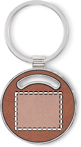 Rund nyckelring i metall med inlägg av återvunnet PU-läder.