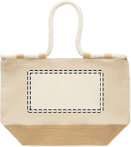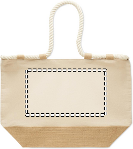 Strandväska i 280 gr/m² bomullscanvas i sidorna och botten i jute samt stägning med dragkedja. Rephandtag som fästs i 10st små jute öglor.