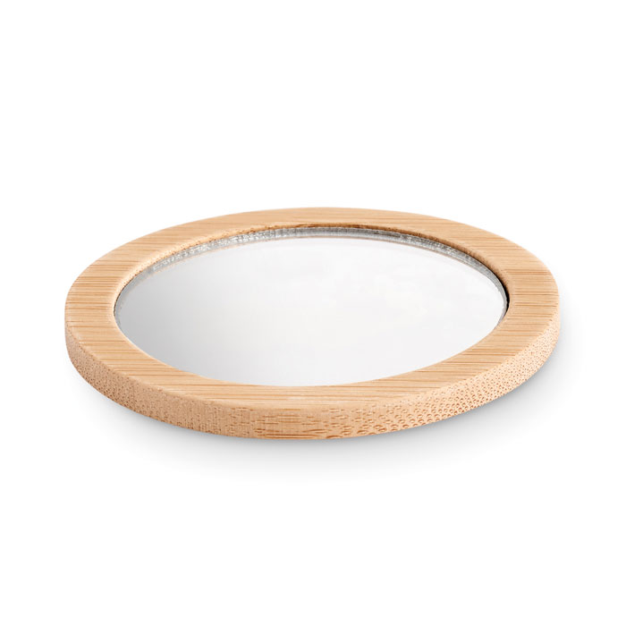 Rundad sminkspegel i bambu. Den här lilla spegeln är idealisk att ha på sig för att applicera din smink eller snabbt se hur smikningen ser ut. Den kommer i en påse med dragsko i bomull. Bambu är en naturprodukt, det kan förekomma små variationer i färg vilket kan påverka det slutliga märkresultatet.