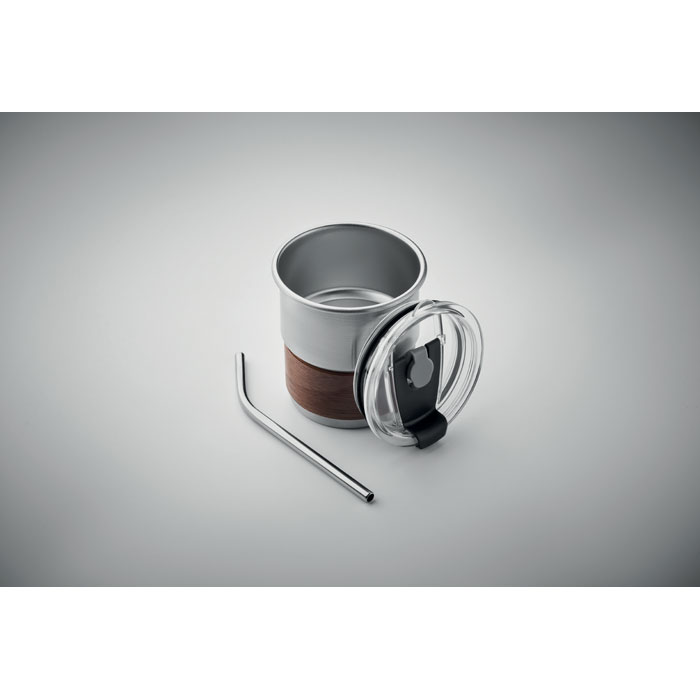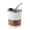 Enkelväggig kopp i återvunnet rostfritt stål (90% återvunnet rostfritt stål och 10% rostfritt stål) med avtagbart grepp i akaciaträ, sugrör i rostfritt stål. Lock med hål för sugrör och dricköppning, läckagesäkert. Volym: 260 ml. Silikongreppet ger dig ett bra grepp och skyddar dina händer från att bränna sig.