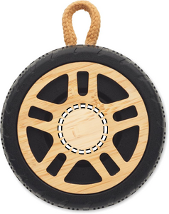 Däckformad trådlös 5.3-högtalare i återvunnen ABS med detaljer i bambu och handtag i bomullsrep. Uppladdningsbart batteri på 400 mAh.