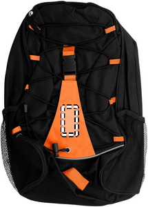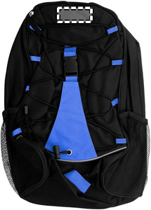 Ryggsäck med kontrastband. Praktiskt gummiband och spänne på ytterpanelen för att fästa föremål. Nätfickor på sidorna. Material 600D polyester.