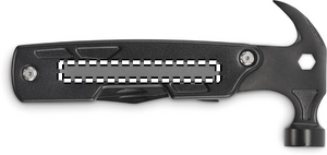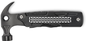 14-i-1 multiverktygshammare i rostfritt stål. Med spikavdragare, insexnyckel, tandad kniv, stålfil, olika skruvmejslar, vanlig tång, spetsig tång, flasköppnare, kniv, avbitartång.