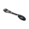 Multiverktygsbestick i rostfritt stål. Verktygen inkluderar sked, gaffel, justerbar skiftnyckel, kapsylöppnare, sexkantsnyckel, tandad kniv, öppnare och positioneringsnyckel.
