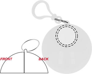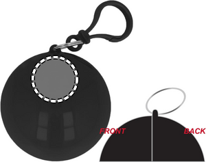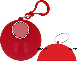 Transparent PE poncho i en boll i AS-plastskal med karbinhake att hänga på ett bälte eller en väska. Kan endast tryckas på plastbollen.