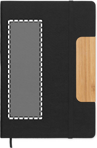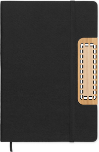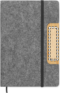 A5 RPET anteckningsblock med hårt omslag i filt, telefonställ och penna med bambuskaft och blått bläck. Inbunden. 160 linjerade sidor av återvunnet papper (80 ark). Elastisk förslutningsband och sidomarkeringsband.