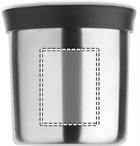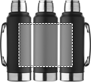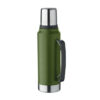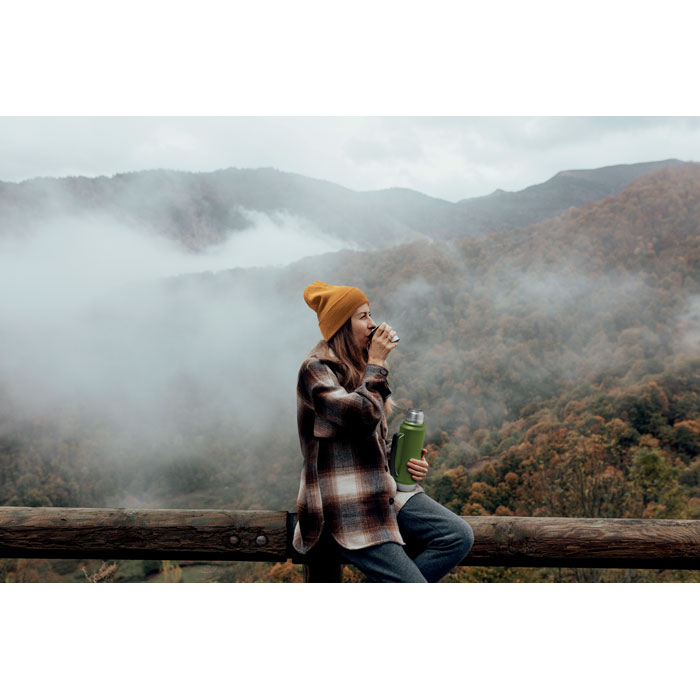 Dubbelväggig vakuumisolerande flaska i återvunnet rostfritt stål (90% återvunnet rostfritt stål och 10% rostfritt stål) med handtag på sidan. Lock i PP och mugg i återvunnet rostfritt stål. Läckagefri. Volym: 1L.
