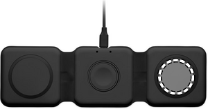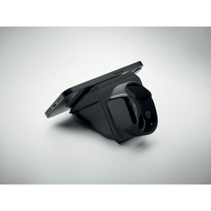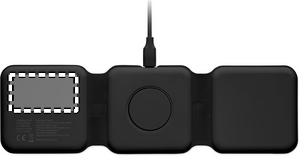 3 i 1 hopfällbar laddningsstation i ABS. Den har 3 trådlösa laddningspunkter. Ingång: 2-i-1 typ-C och typ-A.