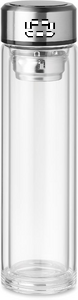 Glas flaska med dubbelvägg i Boroisilikat glas. Borosilikatglas klarar stora tempraturskillnader utan att spricka och lämpar sig väl både för varma och kalla drycker. levereras med LED touchtermometer infälld i locket för att se temperaturen på insidan. Drivs av ett 1 CR2032 batteri, ingår. Läcksäker. Volym: 390 ml. Läckagefritt.
