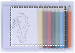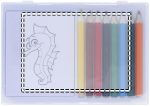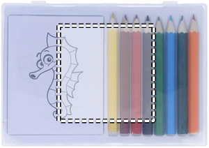Målarset i genomskinlig låda med 8 blyertspennor i trä och 20 teckningar.