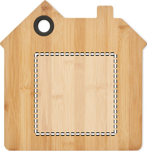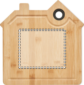 Husformad skärbräda i bambu med avrinningsränna och upphängningshål.