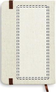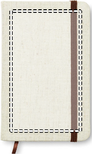 A6 notebook with hard canvas cover. Casebound. 192 lined pages (96 sheets). Contrasting elastic closure strap and ribbon page-marker.