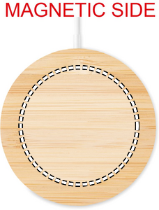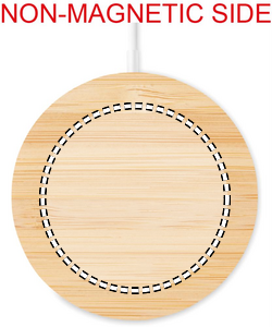 Magnetisk trådlös laddare av bambu. Ladda din smartphone trådlöst med denna laddningsplatta. Eftersom den har en magnet inuti kommer din telefon att kunna fästa mot den, även när du använder din telefon. Bra när du vill ladda din mobila enhet, men också vill ringa eller titta på en video. Denna laddare innehåller en extra magnetisk metallring för att stödja laddning av icke-magnetiska trådlösa laddningsbara telefoner. Kompatibel med iPhone® 12 och nyare. Utgång: DC 9V / 1.1A (10W) för snabb laddning. Bambu ger denna laddare ett mer naturligt och elegant utseende. Bambu är ett naturligt material och det kan finnas små variationer i färg och storlek per artikel, vilket kan påverka det slutliga märkresultatet.