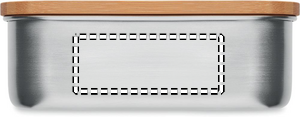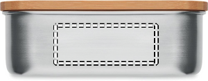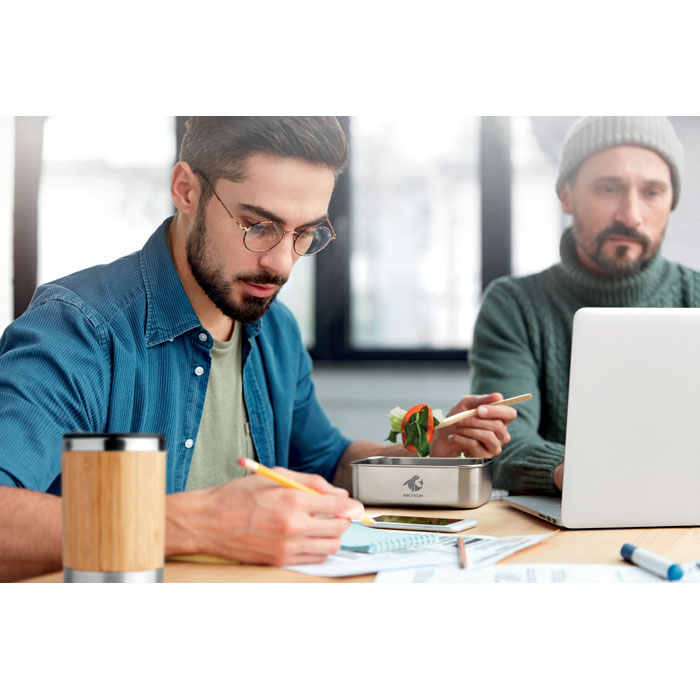 Lunchlåda i rostfritt stål med bambuslock och 2 bestick i polyesterband. Kapacitet 600 ml. Bambu är en naturligt material och det kan finnas små variationer i färg och storlek, vilket kan påverka den slutliga märkning. (ej för mikro)