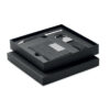 3-delat presentset. Innehållande kulspetspenna med vridfunktion i metall och RPET-polyesterdetalj, RPET-nyckelring i polyester samt RPET-korthållare i polyester med metallplatta. Blått bläck.