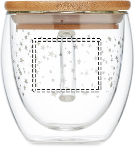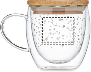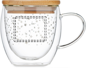 Dubbelväggig borosilikatmugg med stjärnor och bambulock. Kapacitet: 220 ml. Drick ditt favoritkaffe eller te i den här festliga muggen med jultema. Locket i naturlig bambu kan användas som underlägg och ger den en snygg touch. Borosilikatglas är perfekt för att hålla varma vätskor.