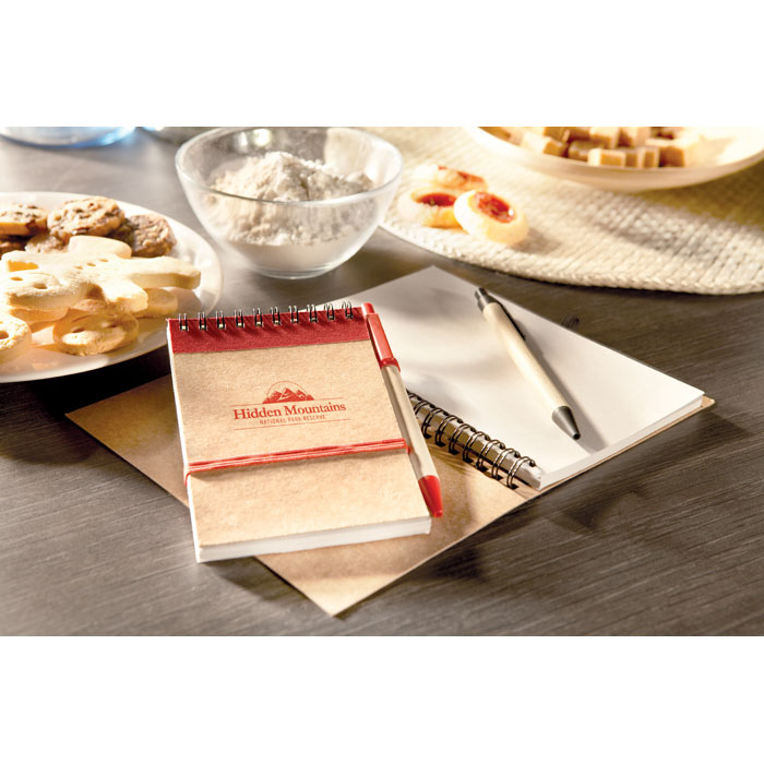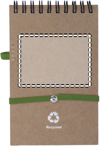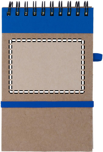 Anteckningsblock i fickformat med 70 blanka sidor i återvunnet papper. Tillhörande penna är återvunnen med biologiskt nedbrytbar plastdelar (53%). Blått bläck.